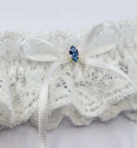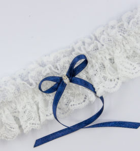 350 KčKlasický svatební podvazek z elastické krajky s tmavě modrou mašličkou a krystalem