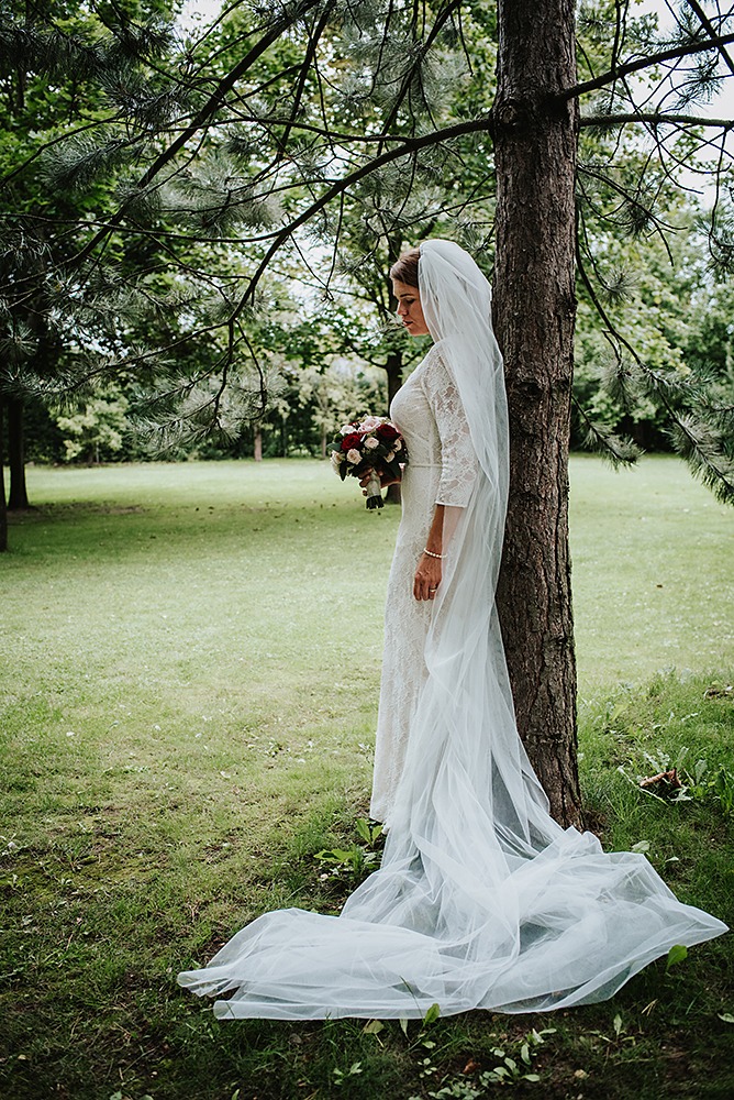 Pro nevěstu Lenku jsme tvořili dlouhý, dvouvrstvý, třímetrový závoj a set modrých vyšívaných podvazků z portugalské krajky. Foto: MONA photography