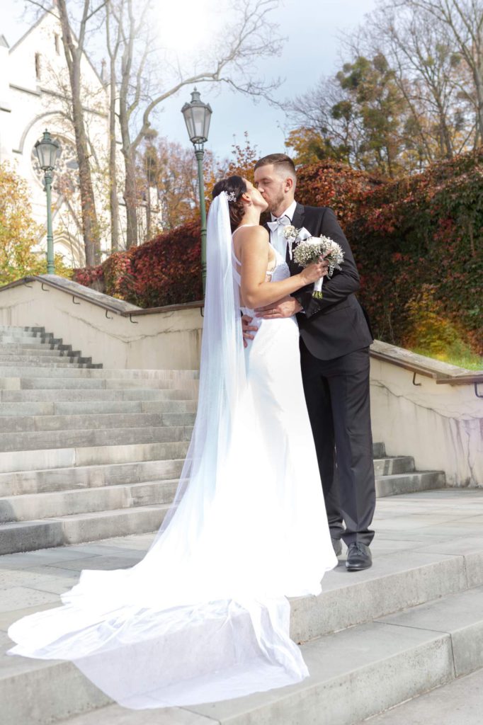 Nevěsta od nás oblékla ve svůj den šaty, dlouhý vlečený závoj a klasický podvazek laděný do barev svatby. Vše jsme tvořili na její přání, podle vysněných představ.