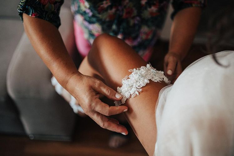 Nevěsta od nás měla tylový svatební podvazek. Hlavní ozdobou byla aplikace z krásné krajky pošité krystaly od české značky PRECIOSA. Foto: Alena Borlová