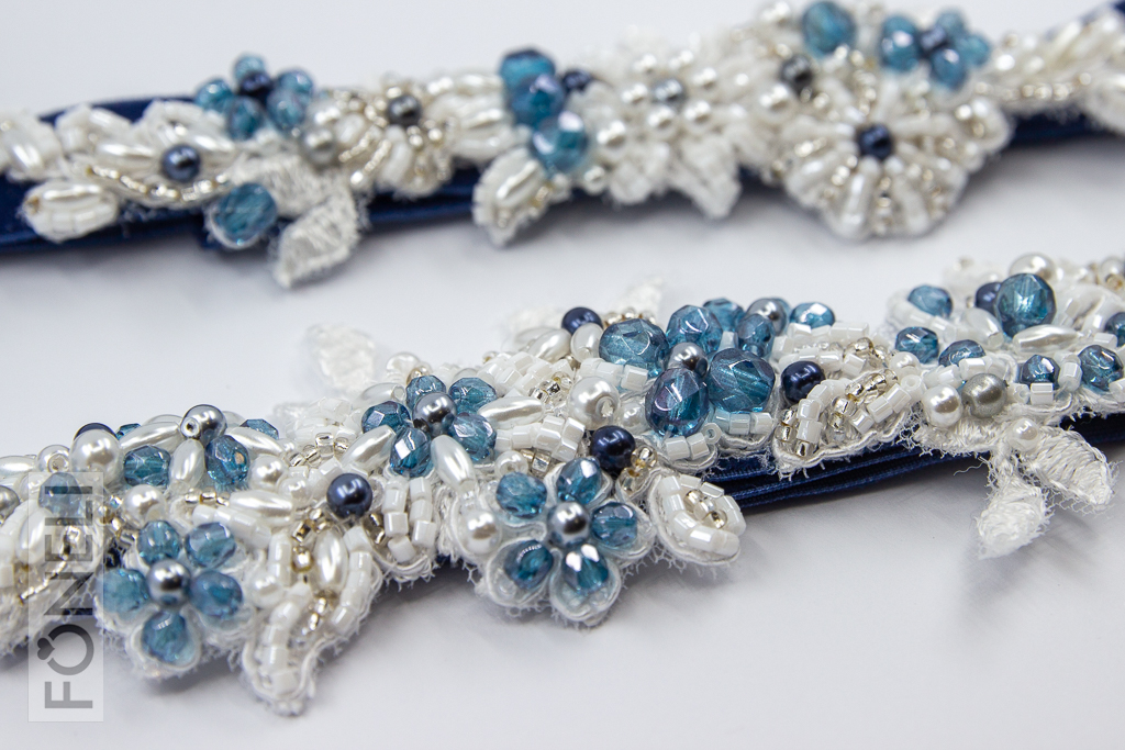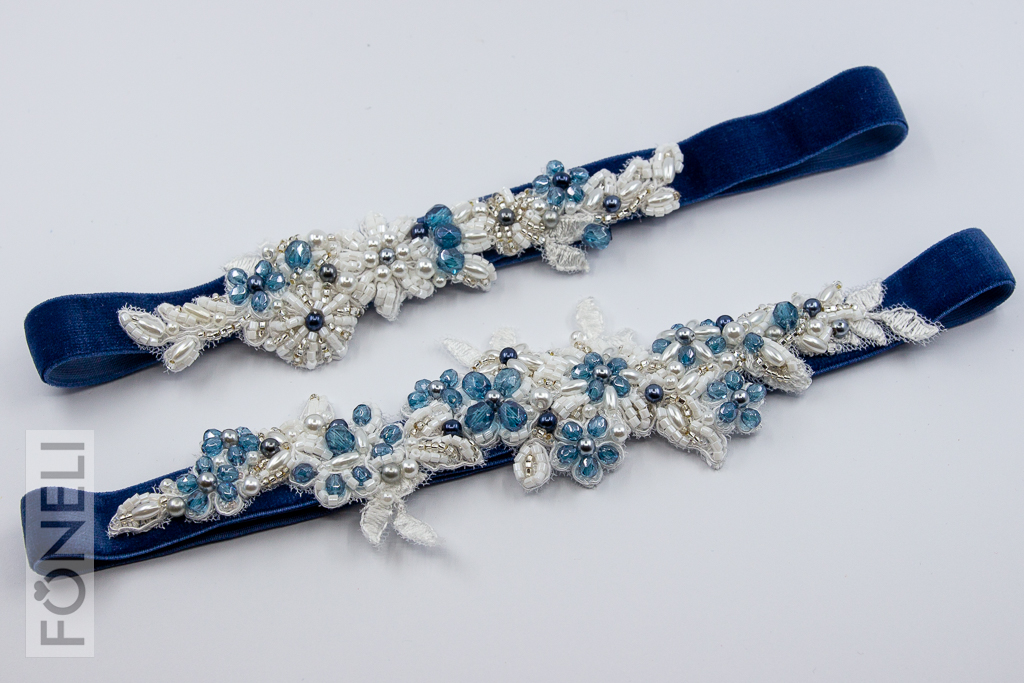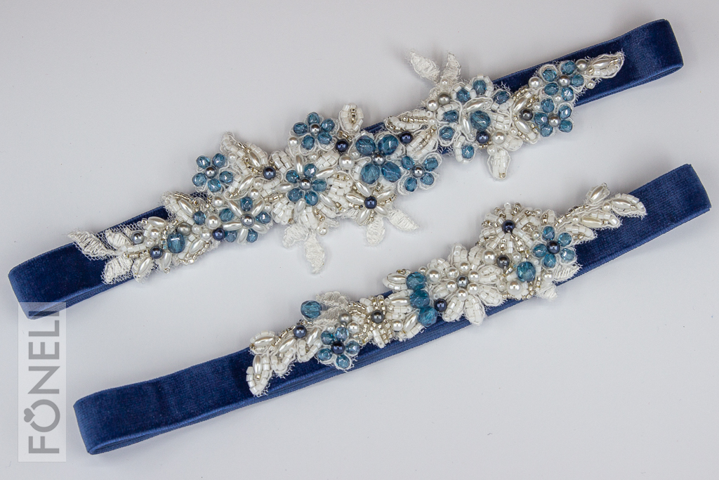 Základem těchto podvazků je krásná portugalská krajka, která je po celém svém vzoru bohatě vyšívaná českými korálky a perličkami. Korálky jsou v barvě bílé a tmavě modré. Pruženka je sametová.