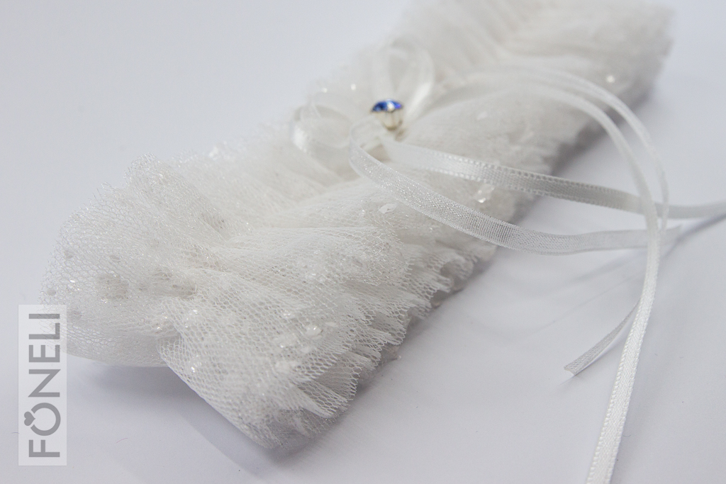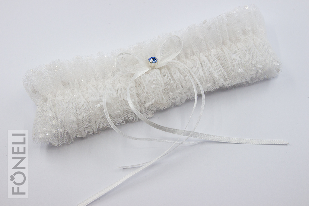 Tylový svatební podvazek zdobený mašličkou a krystalem