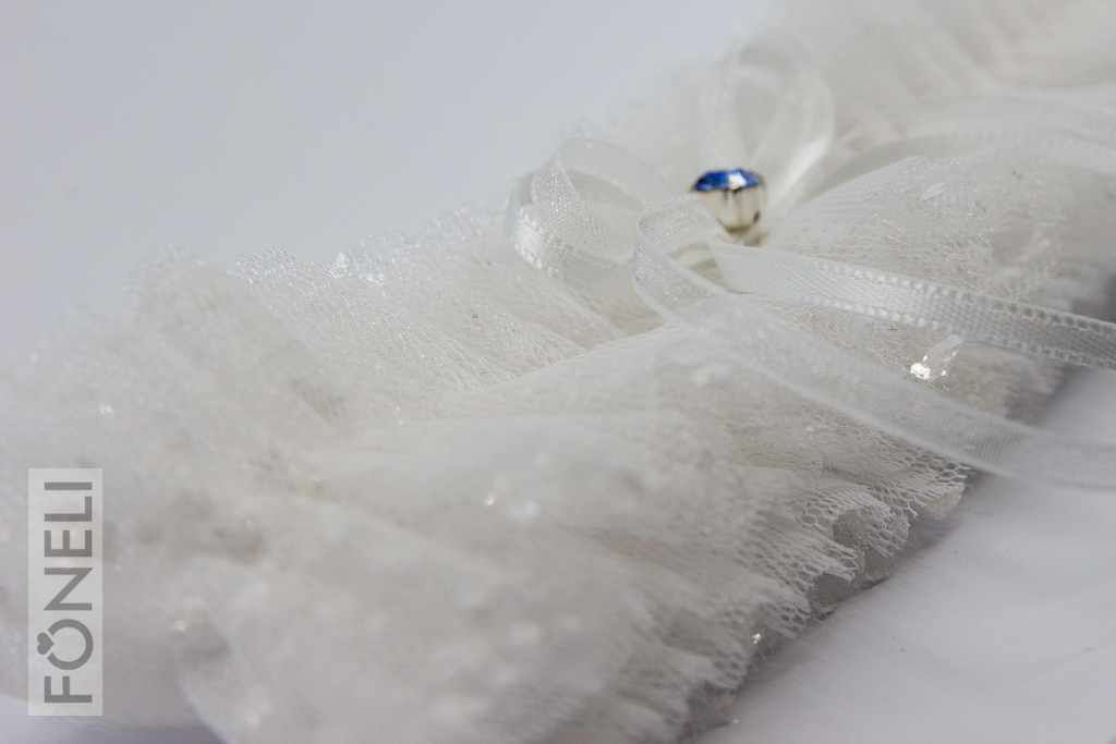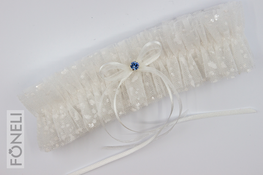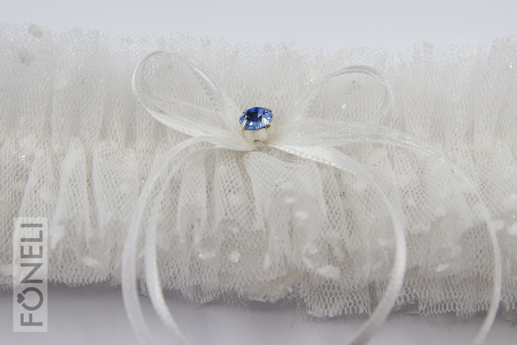 Jednoduchý tylový svatební podvazek. Střed podvazku zdobí krásný modrý krystal PRECIOSA a dvojitá mašlička. Podvazek je několika vrstvami tylu, z nichž jedna má třpytivou úpravu. Šířka podvazku je 4,5 cm.