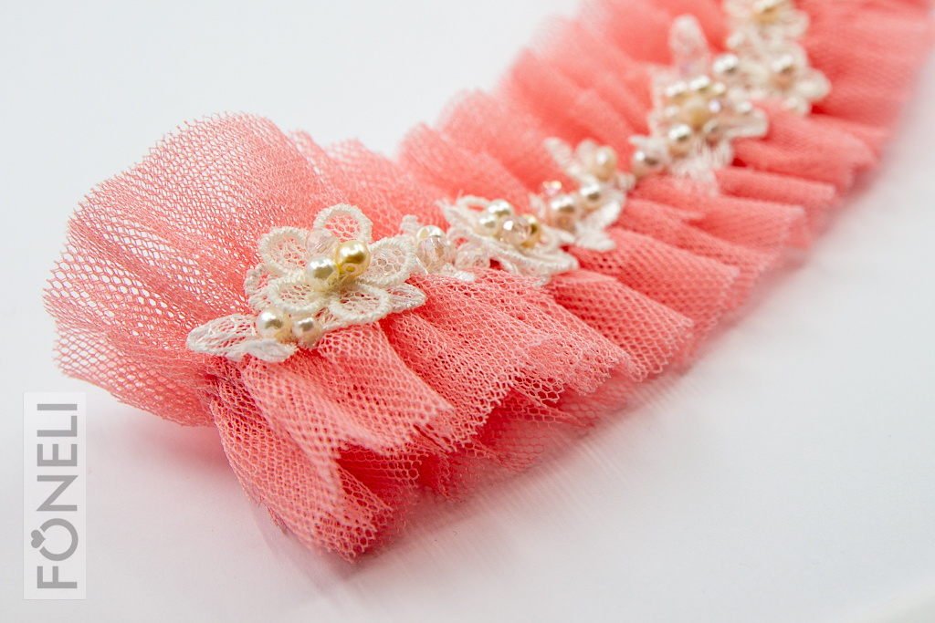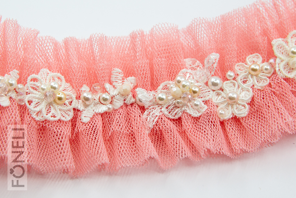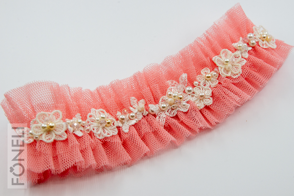 Tylový svatební podvazek je z poloviny svého obvodu vyšívaný krajkovými kytičkami, broušenými korálky a perličkami v krémové barvě. Krajkové kytičky jsou náhodně dozdobené tylovými 3D kytičkami. Šířka podvazku 4,5 cm.